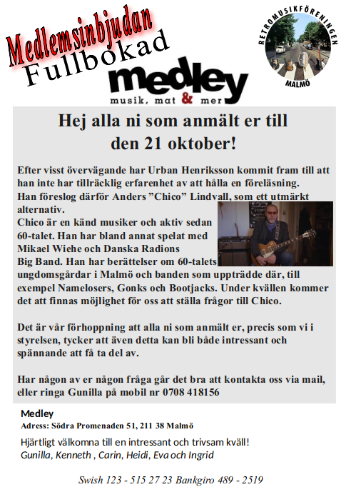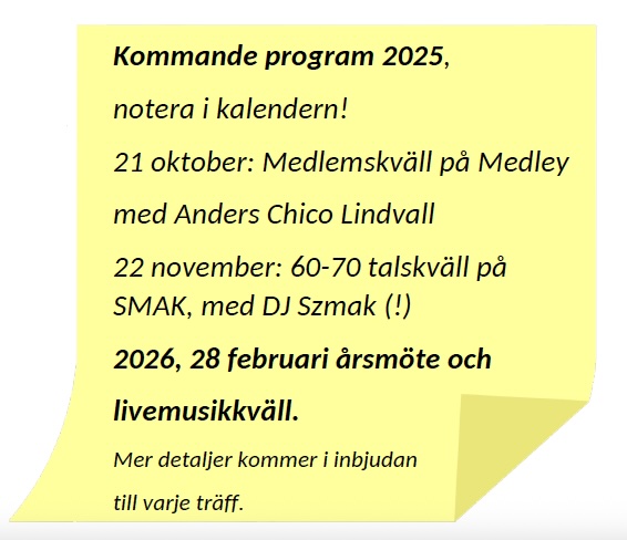 Vi är en mötesplats för 60 & 70-talets musik, minnen och gemenskap. Genom stämningsfulla live musikkvällar och andra evenemang bjuder vi in till en musikalisk tidsresa fylld av energi, nostalgi och ren spelglädje. Oavsett om du själv stod på scen då det begav sig, växte upp med vinylerna snurrande eller har upptäckt musiken senare i livet så är du varmt välkommen in i gemenskapen.