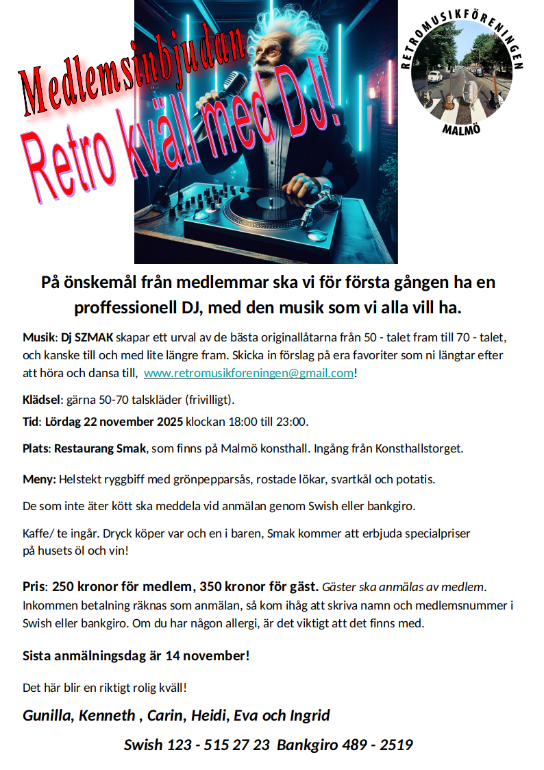 Vi är en mötesplats för 60 & 70-talets musik, minnen och gemenskap. Genom stämningsfulla live musikkvällar och andra evenemang bjuder vi in till en musikalisk tidsresa fylld av energi, nostalgi och ren spelglädje. Oavsett om du själv stod på scen då det begav sig, växte upp med vinylerna snurrande eller har upptäckt musiken senare i livet så är du varmt välkommen in i gemenskapen.