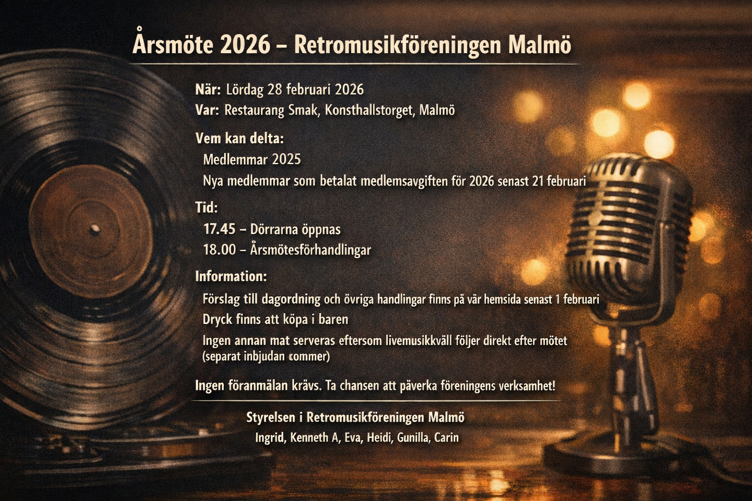 Vi är en mötesplats för 60 & 70-talets musik, minnen och gemenskap. Genom stämningsfulla live musikkvällar och andra evenemang bjuder vi in till en musikalisk tidsresa fylld av energi, nostalgi och ren spelglädje. Oavsett om du själv stod på scen då det begav sig, växte upp med vinylerna snurrande eller har upptäckt musiken senare i livet så är du varmt välkommen in i gemenskapen.